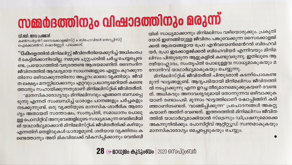 An article on ‘Minimalism’. Published in Kudumbam Magazine