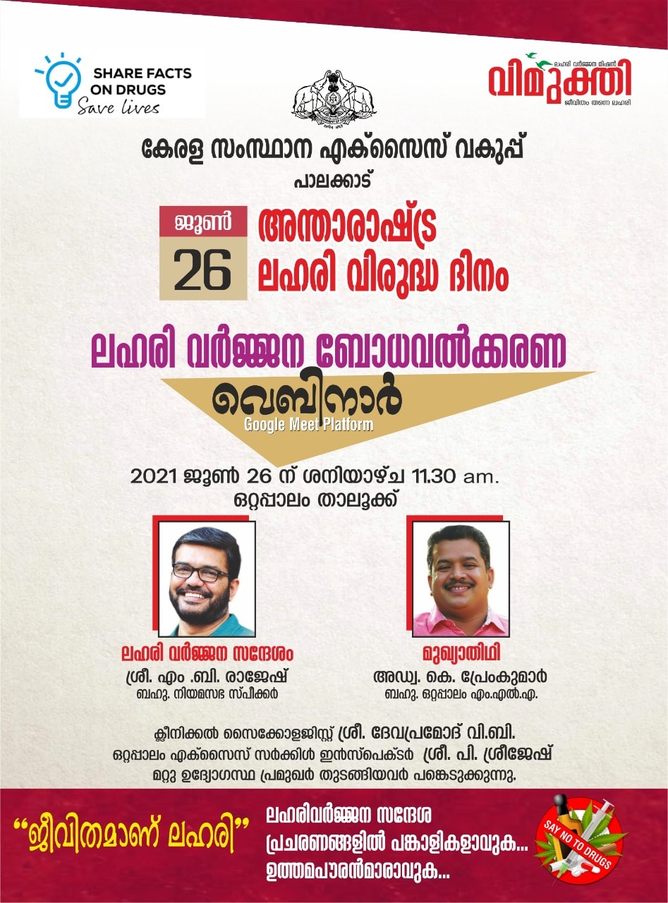 A Webinar on Anti Drug Awareness International Day against Drug Abuse and Illicit Trafficking 2021. Organised by Kerala Excise Department